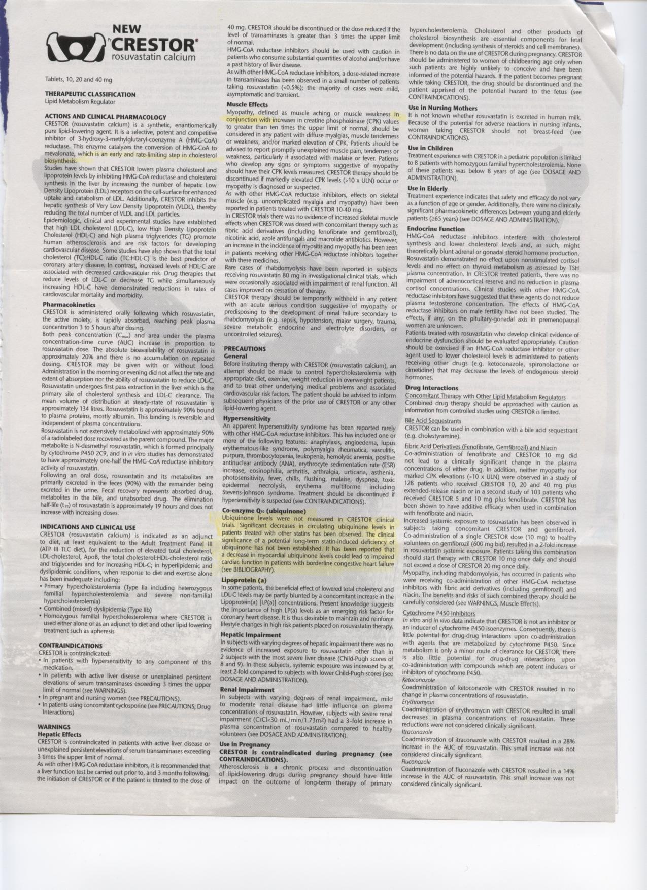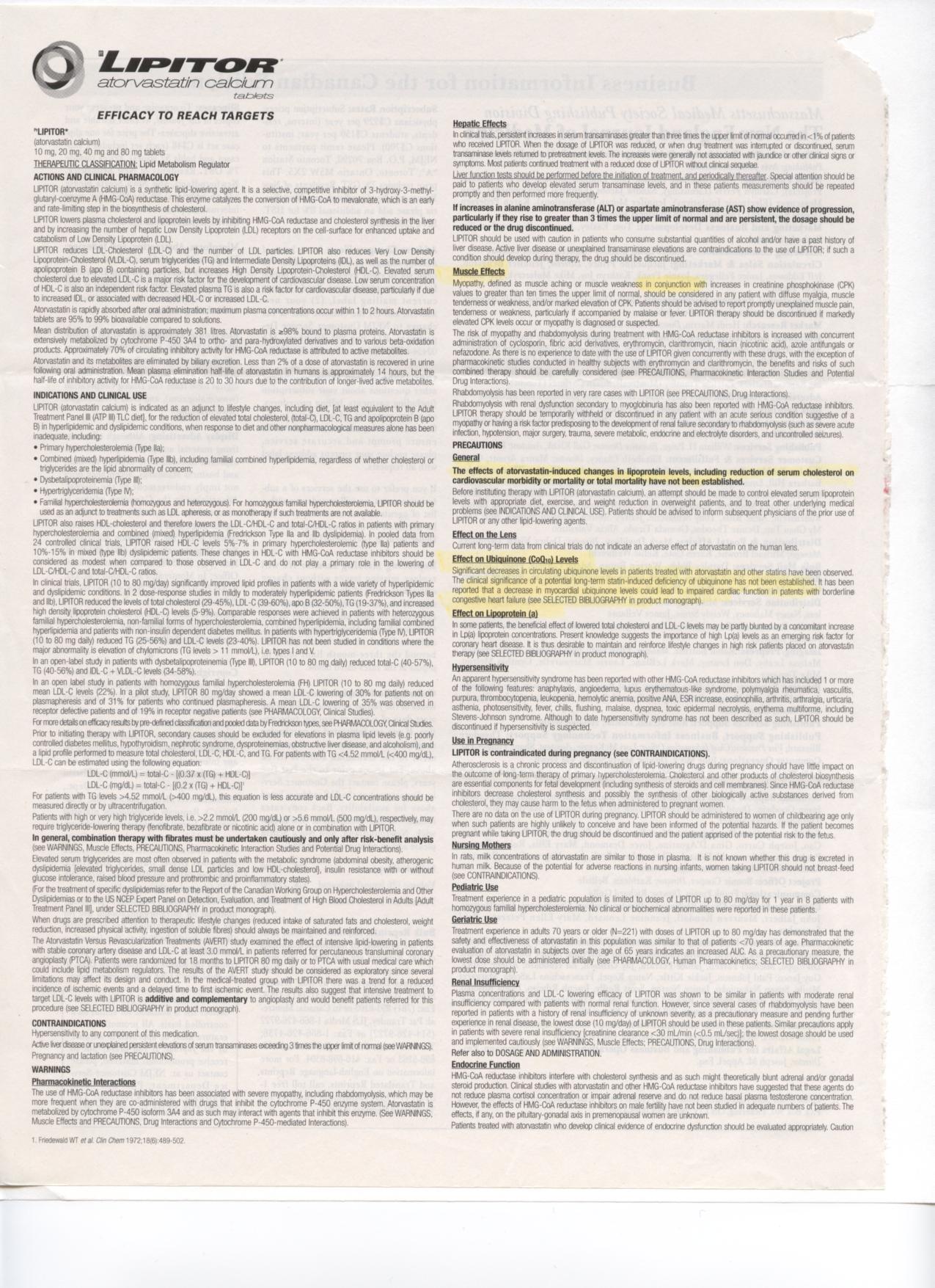 From our experts:"Scroll to page 7, Warnings. Note Lipitor potential for liver damage is increased by alcohol consumption. Also since Lipitor is metabolized by the Cytochrome P450 enzyme system, taking it with grapefruit juice which contains naringen, a Cytochrome P450 antagonist could amplify Lipitor's potential to cause myopathy. Myopathy is any disease or abnormal condition of striated muscle. This is brought about because lipitor reduces ubiquitone levels (page 9). Note that the use of NIACIN may make the myopathy worse. Myopathy leads to congestive heart failure. (The antidote is 60-500 mg of coQ10 and 500 mg- 1500 mg of L-Carnitine daily). All this is missing from the U.S. version.